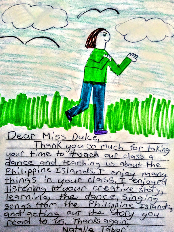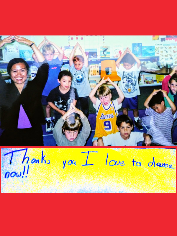 In addition to her formal dance training, she specializes in teaching younger children having been trained by Kidd Street Performing Arts Studio's Founder, Timothy Kuster. For over a decade, she served as the Dance Artist in Residence in all of the "Blue Ribbon" (high level performance) elementary schools throughout the Manhattan Beach Unified School District; her well-loved, popular touring dance program was enjoyed by thousands of classroom students, their parents and the school community during her tenure. Sharing her expertise in folk cultures, Dulce can be found teaching the bamboo dance "Tinikling" (considered the national dance of the Philippines) on the Multicultural Folk Dance video published by Human Kinetics (one of the nation's largest publishing houses) and produced by America's most popular dance educator, Christy Lane.